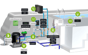 iQnnect uses extensions to integrate devices such as heat pumps, filter pumps, underwater lighting, and water treatment systems. Basically, all devices that are compatible with a Loxone extension can be easily integrated into the iQnnect system. This allows the expansion of an iQnnect basic installation with additional components such as pool covers, video surveillance, counter-current systems, outdoor lighting, photovoltaic systems, and much more.