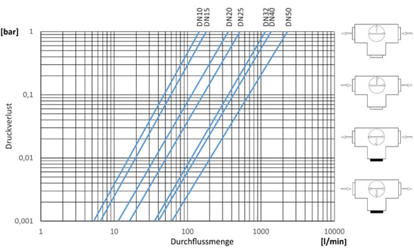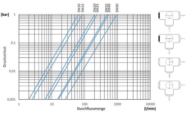 Flow rate - pressure loss 3-way ball valve / T-ball / -position