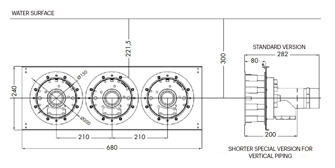 Wall fitting set TriVA 150 containing: - Wall fitting TriVA nozzle - Wall fitting switch - 4x wall fitting Wave40