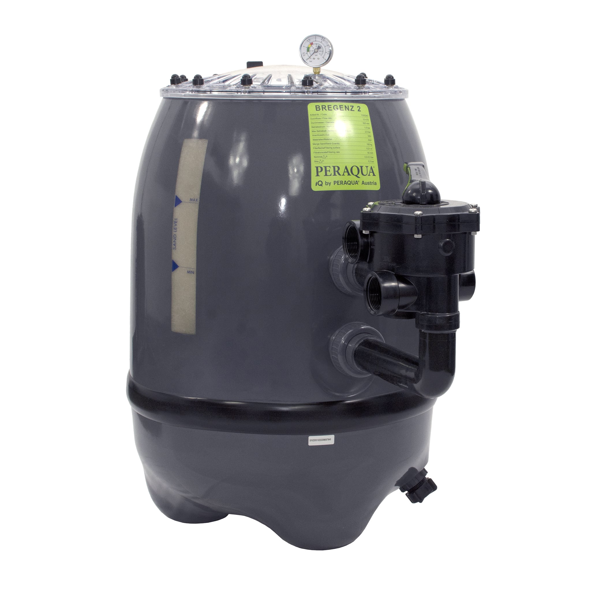 Der große transparente Deckel, das Sichtfenster für die Sandhöhe und die große Entleerung machen die Filterserie Bregenz 2 besonders inspektions- und wartungsfreundlich.
