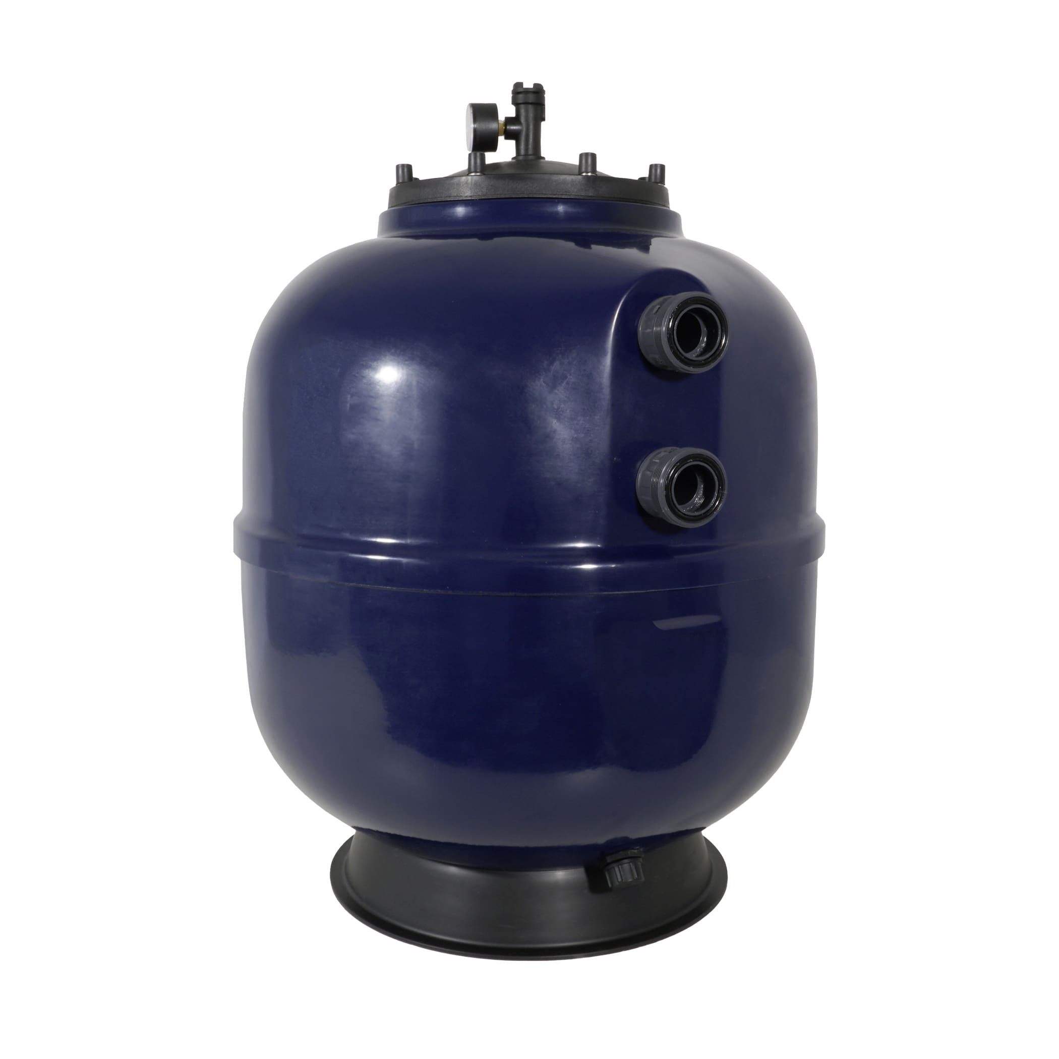 Laminierter Side Mount Filter für private Pools aus glasfaserverstärktem Kunststoff. Handgefertigt, um maximale chemische und mechanische Resistenz gewährleisten zu können. Die Einbauteile werden aus PP, ABS und PVC gefertigt. Alle verbauten Schrauben sind aus hochfestem, korrosionsbeständigem INOX (rostfreier Stahl), Muttern aus vernickeltem Messing. Lieferung mit Entlüftungsventil und Manometer. Schwarzer Flanschdeckel (d300 mm).